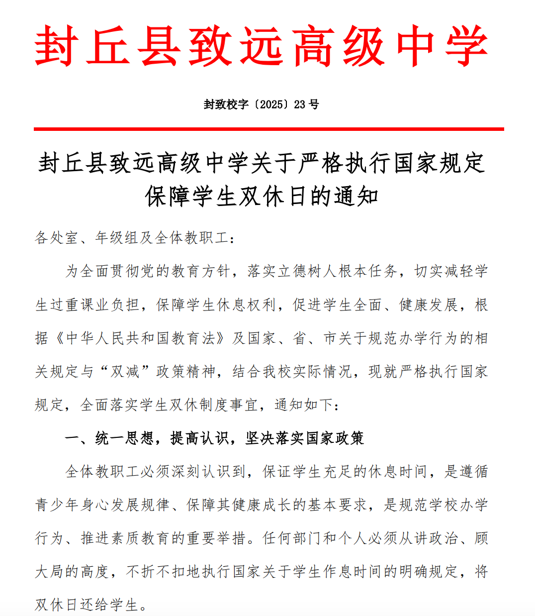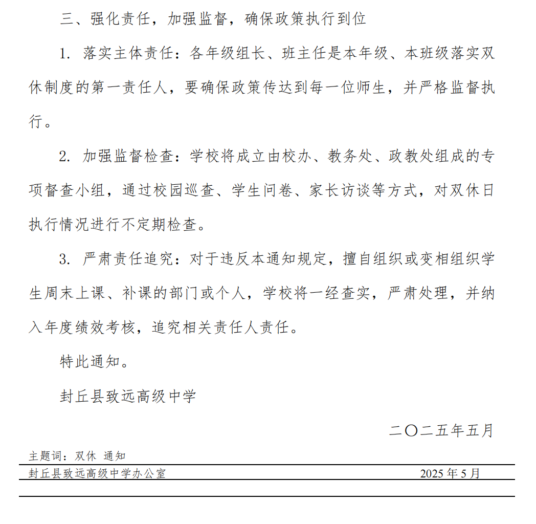 封丘县致远高级中学关于严格执行国家规定保障学生双休日的通知